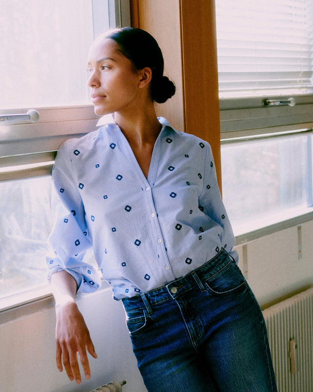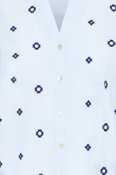 Effortless elegance meets everyday comfort in this lightweight cotton shirt. The classic v-neck collar and long sleeves offer timeless style, while delicate navy embroidery adds a touch of personality. Perfect for layering or wearing solo, this piece transitions seamlessly from casual weekends to polished workdays. Breathable fabric keeps you cool and comfortable all day long.