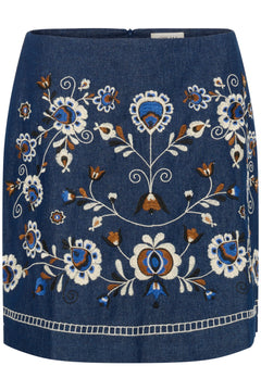This embroidered mini skirt features a straight fit and ornate, floral-inspired detailing. The comfortable waistband and mid-thigh length make it ideal for both casual and semi-formal outfits. Stylish choice for any occasion.