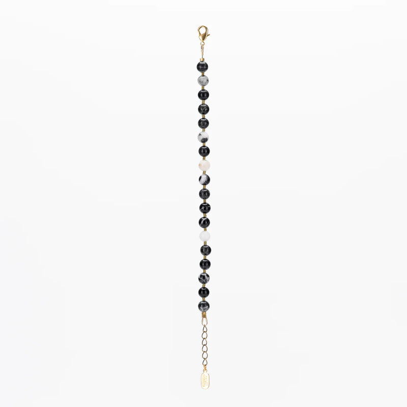 The Firth Bracelet features smooth round Zebra Jasper gemstone beads, accented with gold-plated Hematite spacers to add visual interest. Wear it alone for a subtle look or layer with other pieces for a bold statement.