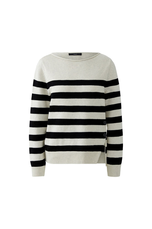 Channel timeless style with the Oui Striped White Black Jumper, a monochrome essential that blends graphic simplicity with everyday comfort. Crafted from a soft knit blend, this jumper features evenly spaced black horizontal stripes across a crisp white base, offering a clean, modern look. The crew neckline and long sleeves keep the silhouette classic, while the relaxed fit ensures effortless wear.