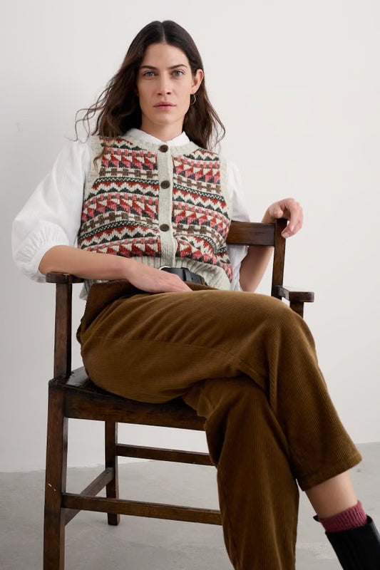 A warm layer for cooler days, this sleeveless sweater vest is made with a cosy blend of RWS-certified Merino wool and recycled nylon. Complete with a traditional Fair Isle stitch and a ribbed trim along the neck, hem and armholes, we love it buttoned down over casual collared shirts and paired with comfortable cord trousers for that rustic, autumnal feel.